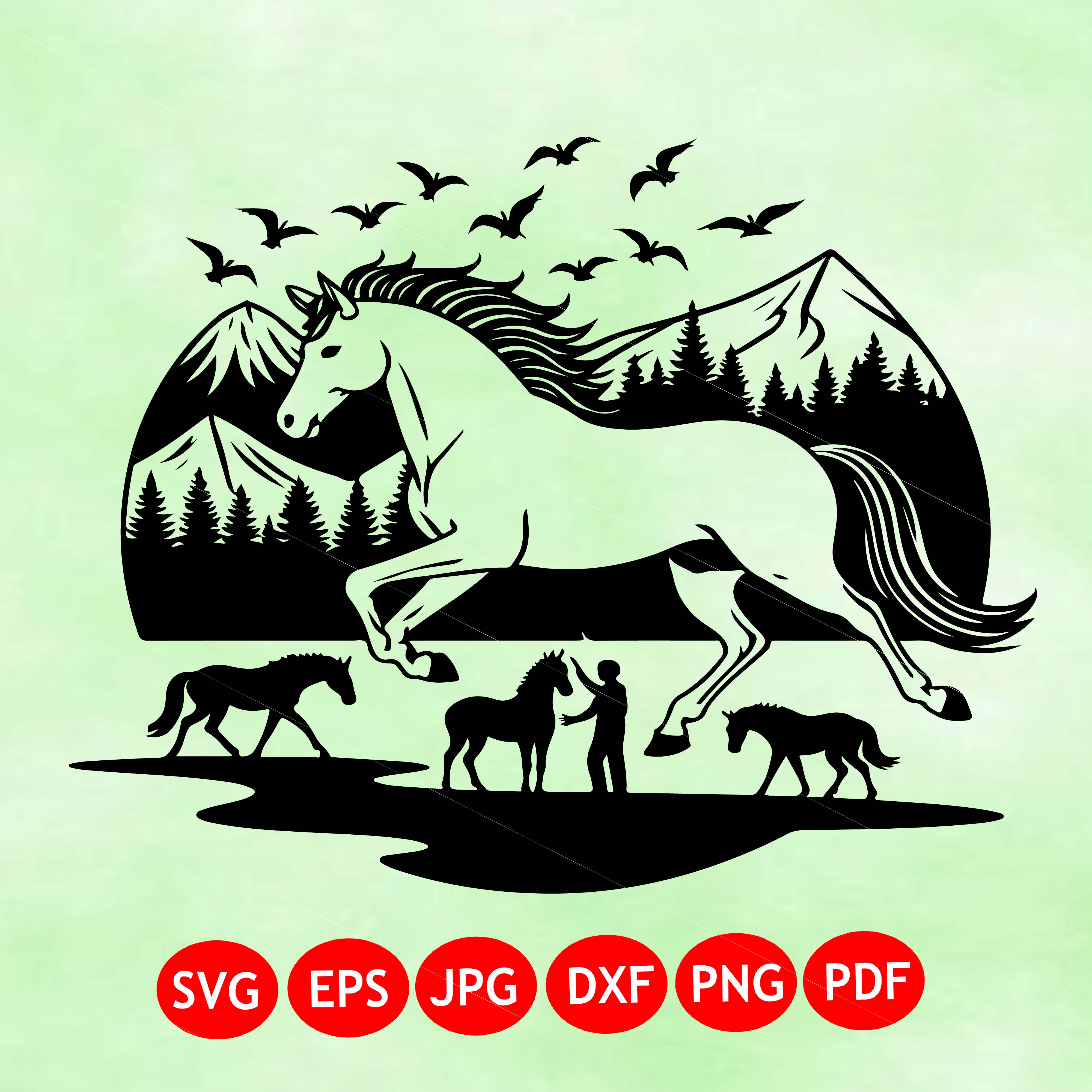 Running Horse SVG: Mountain Forest Scene (Instant Download, PNG, SVG Files)